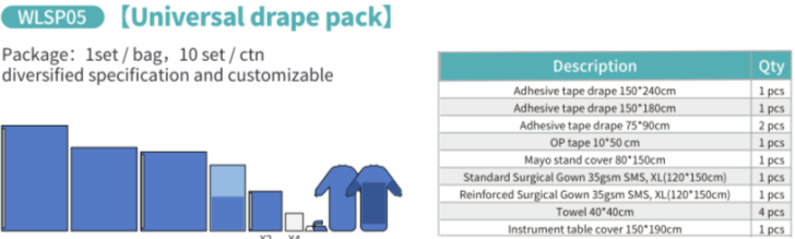 Disposable Universal Surgery Pack is a comprehensive pack that is designed to provide all the essential resources needed during surgical procedures. This Universal Surgery Drape set is made from high-quality materials ensuring maximum hygiene and safety for patients. Surgery Drape Packs are an essential resource for healthcare professionals during surgical procedures. It ensures maximum hygiene and safety for patients and is easy to use and dispose of after use. With its comprehensive design and use of high-quality materials, it provides all the necessary resources needed for surgical procedures.